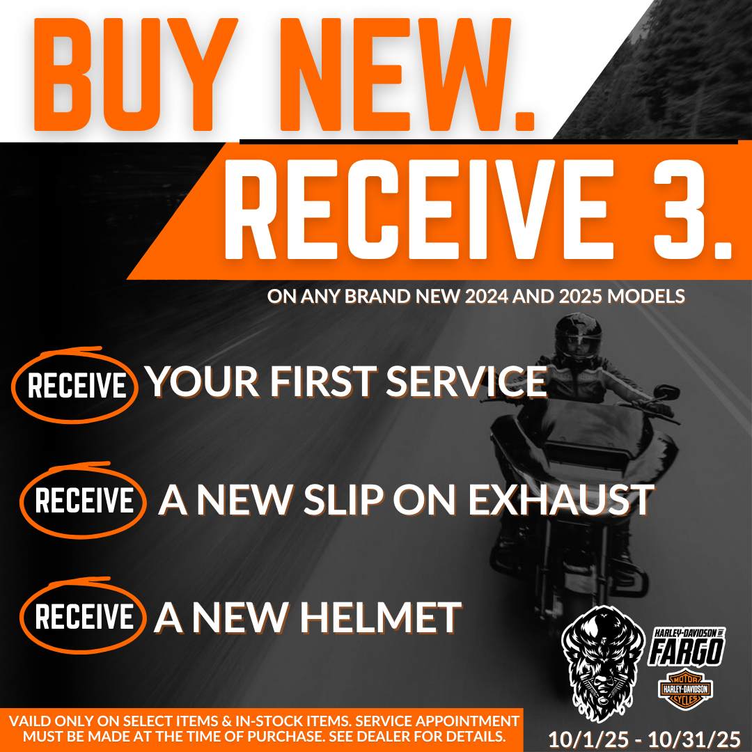 At Harley-Davidson of Fargo, purchase any new untitled 2024 or 2025 Harley-Davidson Motorcycle and receive a helmet, a new slip-on exhaust, and a 1K service.