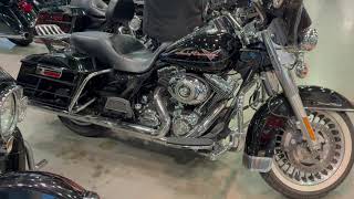 Harley-Davidson® styling heritage meets long-range riding comfort in the Road King®. The large, detachable windshield and hard-shell saddlebags make this a versatile motorcycle suitable for touring or commuting. Classic styling touches include the chrome Hiawatha headlamp and clear-lens auxiliary passing lights, chrome engine covers, a deep-skirted FL front fender and white-stripe tires. The seat has been restyled for 2009 with chrome accents and a new low-mount license bracket locates the plate below the tail lamp, with new LED license plate illumination.