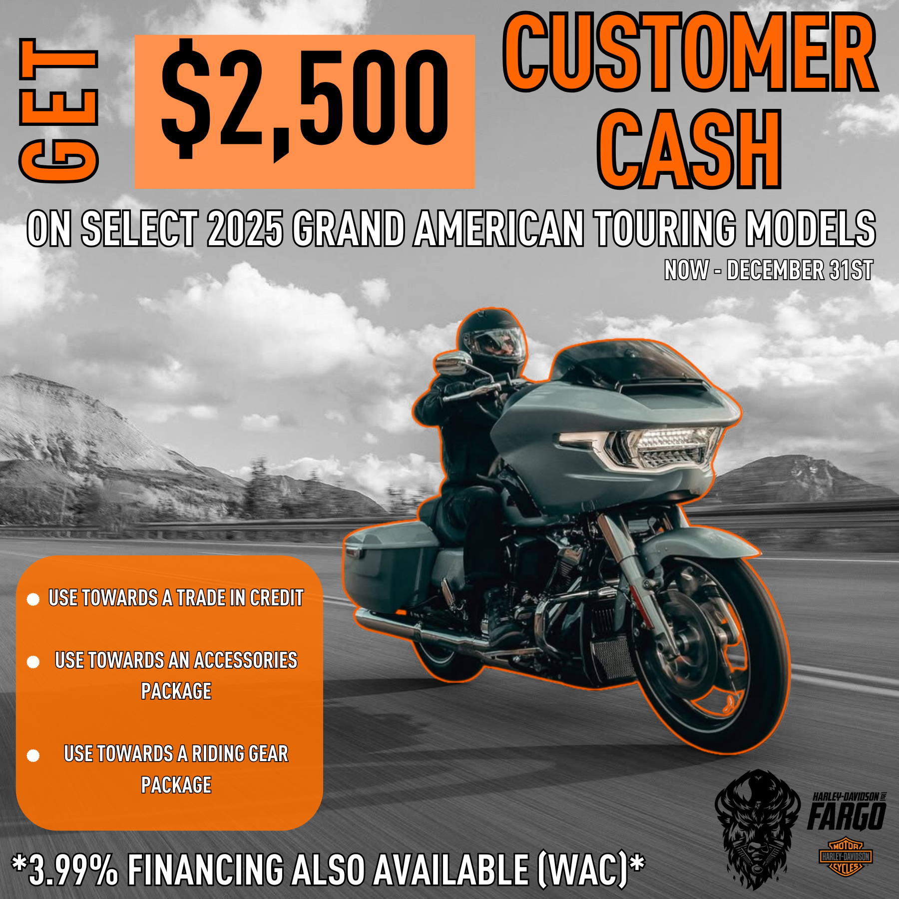 Get up to $2,500 in Customer Cash on select 2025 Grand American Touring Models, NOW-November 29th.
