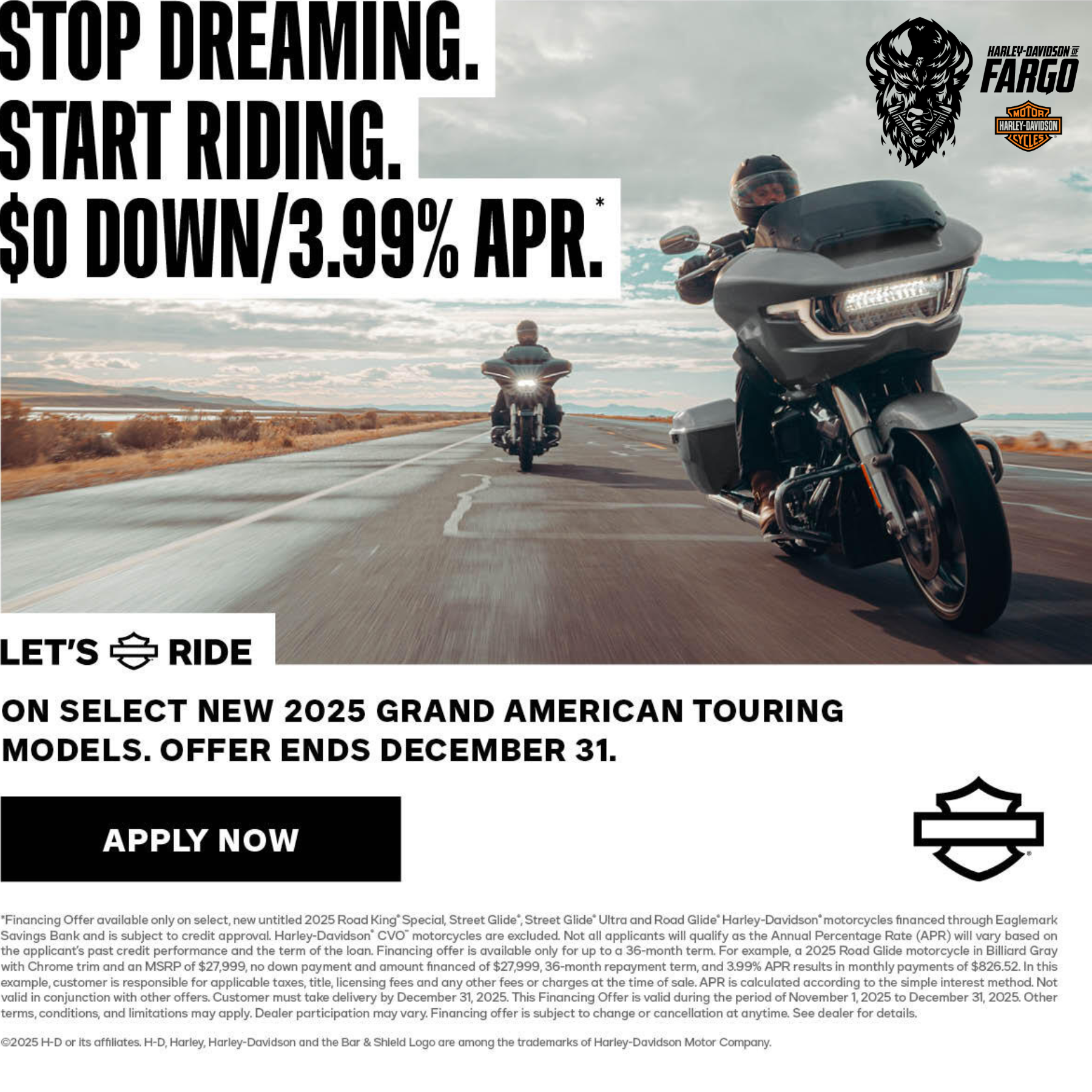 Stop dreaming and start riding shop now at J&L Harley-Davidson and Glacial Lakes Harley-Davidson get $0 Down PLUS 3.99% APR on select 2025 Grand American Touring Models, NOW-December 31st.