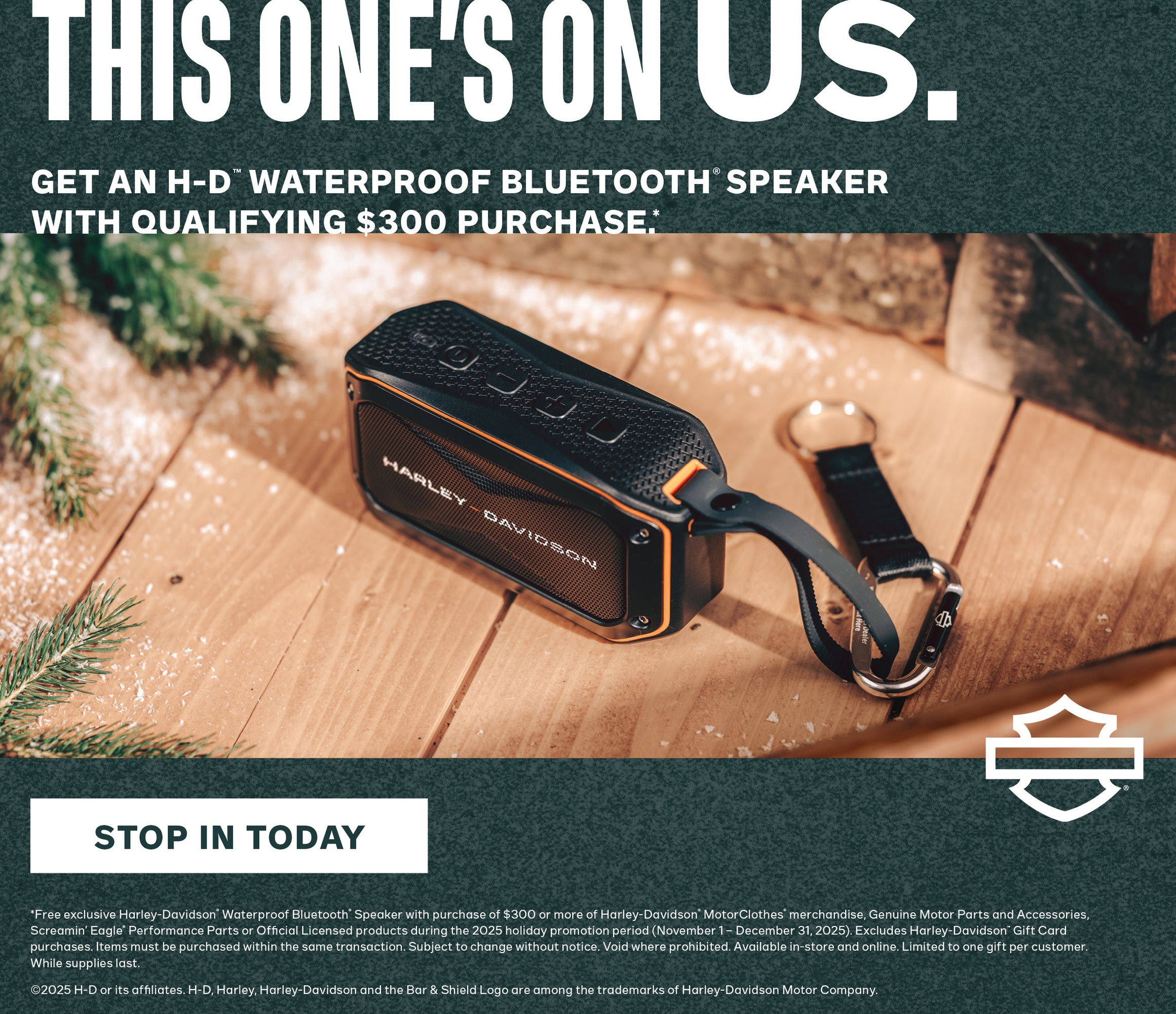 *Free exclusive Harley-Davidson® Waterproof Bluetooth® Speaker with purchase of $300 or more of Harley-Davidson® MotorClothes® merchandise, Genuine Motor Parts and Accessories, Screamin’ Eagle ® Performance Parts or Official Licensed products during the 2025 holiday promotion period (November 1 – December 31, 2025). Excludes Harley-Davidson™ Gift Card purchases. Items must be purchased within the same transaction. Subject to change without notice. Void where prohibited. Available in-store and online. Limited to one gift per customer. While supplies last. See dealer for complete details.