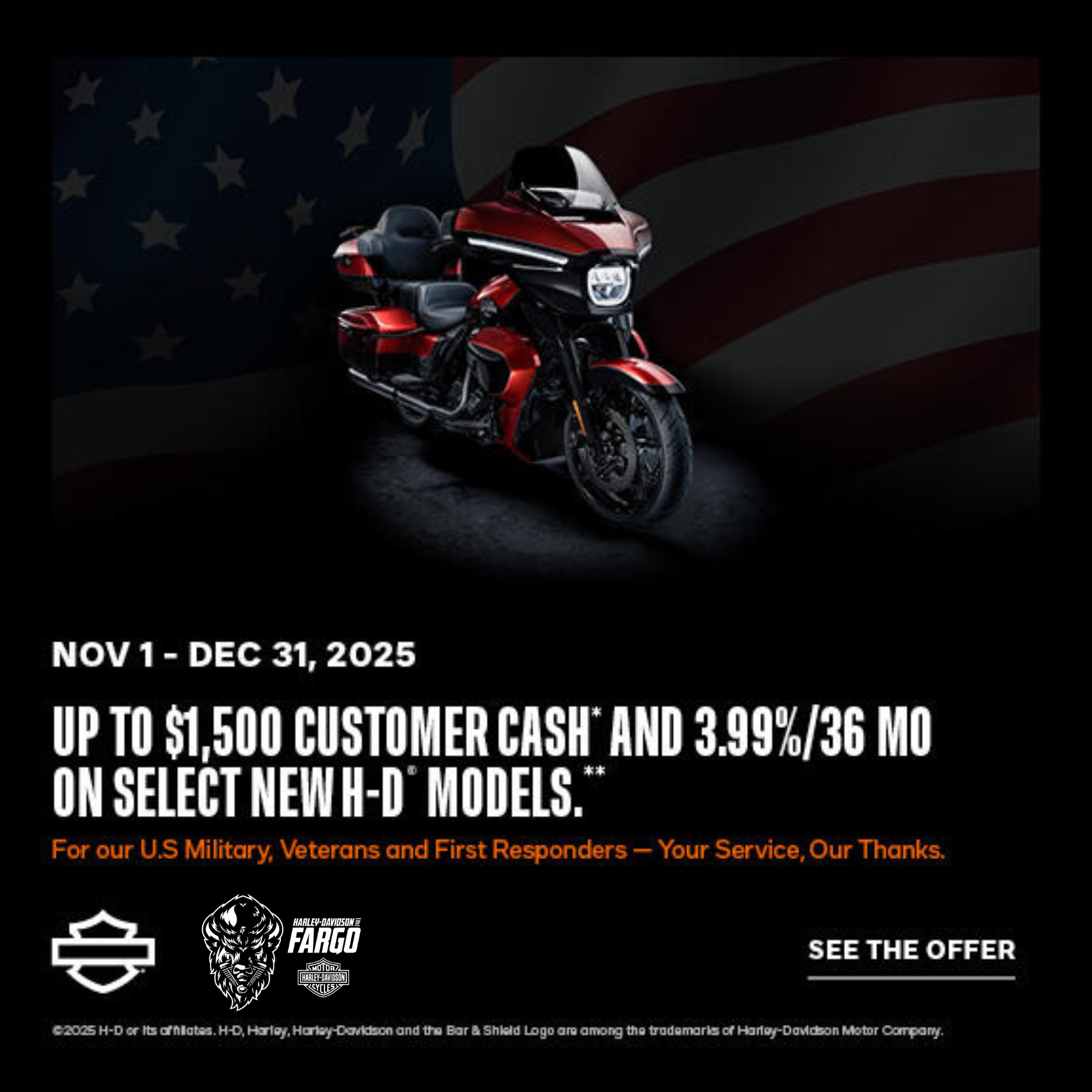 We salute U.S. Military and Veterans with up to $1,500 Customer Cash and 3.99%/36 Month on select New H-D Models